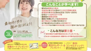初心者向け マネーセミナー 受講費無料 / 無料個別相談可能 大好評!知ってると得する 賢いお金のふやし方 大公開 無駄なお金の削減と増やし方がわからない。 そんな、みなさんのお悩みを上級ファイナンシャルプランナーが解決! 知識×行動力で将来が決まる! まずは最初の1歩を踏み出しましょう!