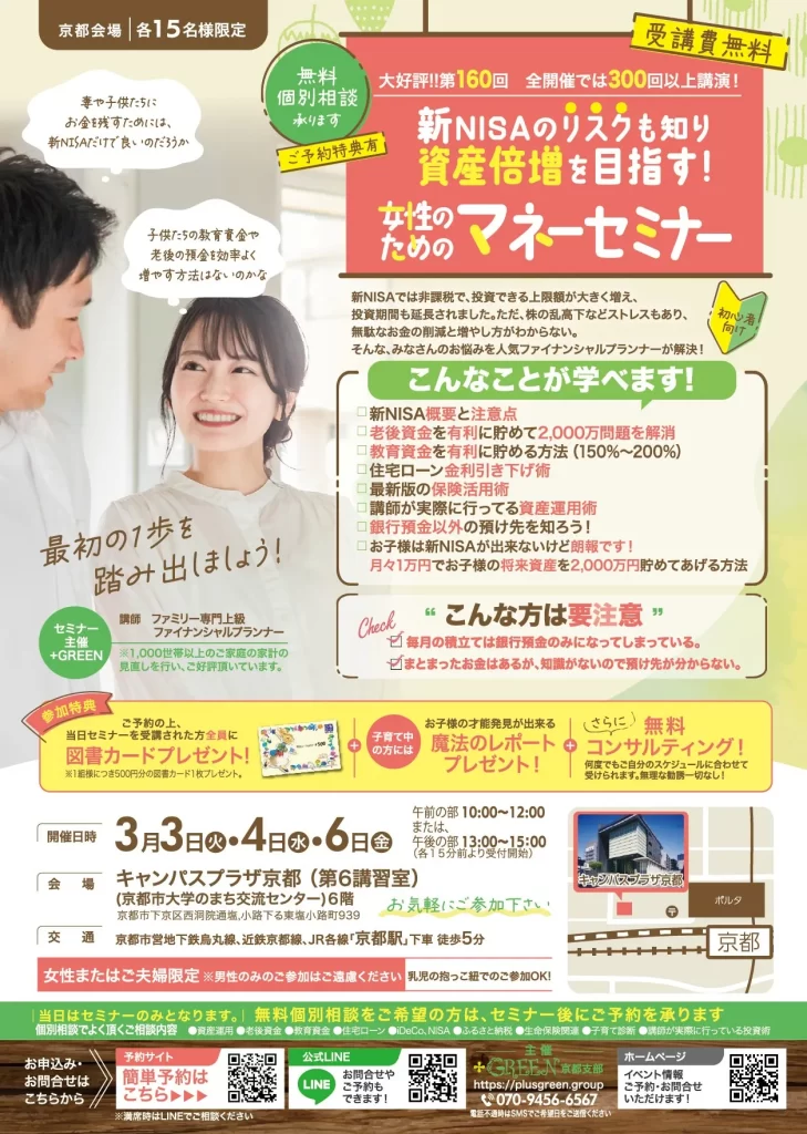 セミナーでは金融商品の斡旋や販売はございませんので、まずは知るために気軽に無料で参加いただけます。セミナーに参加して実際に行動に移したい場合は、後日になりますが無料で個別相談もございます。金銭感覚に優れたファイナンシャルプランナーがメンターとなり、総合的にアドバイスしてくれますので、この機会にまずはお気軽にセミナーにご参加下さい。