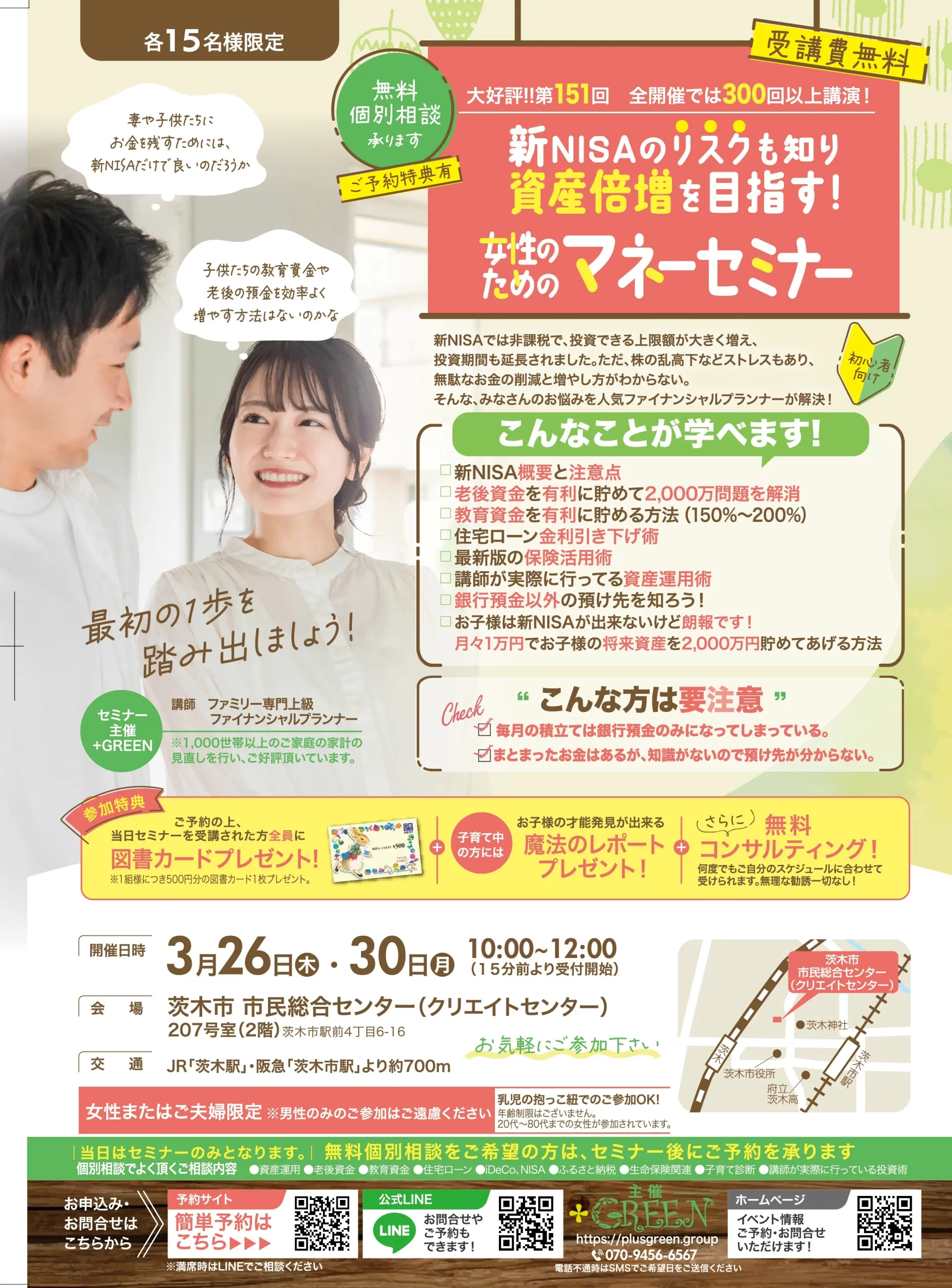 主な内容は、教育資金をはじめ、住宅ローン、老後資金の確保、資産運用するための投資方法、必要な保険と無駄な保険の理解など。iDeCoやNISA、ふるさと納税など聞いたことはあるけど、実際に理解して実行するにはどうしたら良いかわからず行動に移せてない方などにオススメのセミナーです。